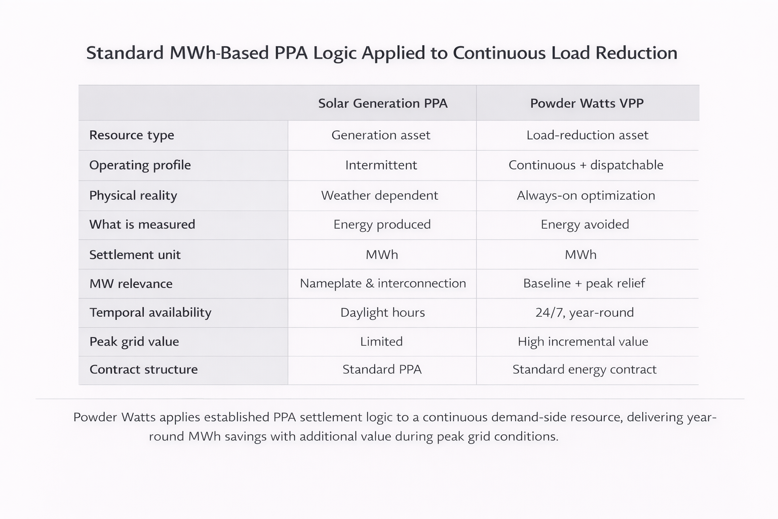 From a portfolio perspective, this structure is both standard and additive. Solar PPAs monetize daytime MWh; Powder Watts monetizes winter peak-hour MWh reduction. Both rely on independent metering, forecasting, and verification. Both can be contracted, banked, and modeled. And both are already familiar to utilities, ISOs, and sophisticated power buyers. Importantly, Powder Watts does not require new transmission, fuel supply, or interconnection queue positions, which allows it to function as a near-term capacity relief mechanism while still fitting cleanly into existing PPA and energy-accounting conventions.